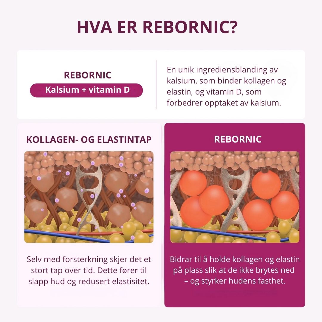 Kollagen er proteinet som holder huden din fast og ungdommelig. Når du blir eldre, produserer kroppen mindre kollagen og elastin, og kalsiuminnholdet i huden reduseres. Dette svekker huden, bremser fornyelsen og gjør at rynker dannes raskere og gjenoppbygges langsommere.