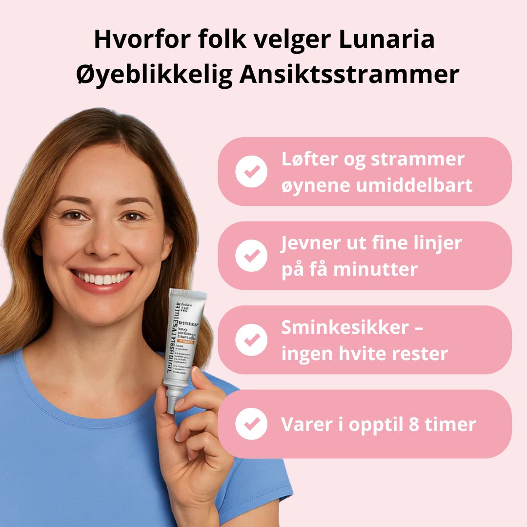 Lunaria Øyeblikkelig Ansiktsstrammer forandrer alt på bare 3 minutter. Den løfter, strammer opp og frisker opp huden under øynene, slik at du ser våken, glatt og selvsikker ut.
